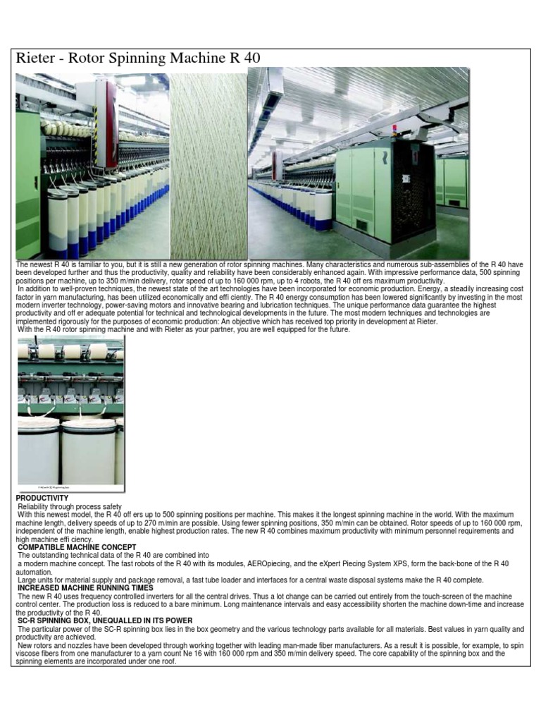 Rieter Machine : Products - Repcom Textile Machinery - Acquisition in june 2017, rieter acquired ssm textile machinery division.. In 1982, rieter acquired the british textile machinery company ernest scragg & sons ltd.3 the group took over automatik. Rieter is a producer of textile machinery based in winterthur, switzerland. The compacting device compactdrum for the rieter ring spinning machine is easy to install and remove. The fully automatic rotor spinning machine r 66 sets the standard for quality and productivity. Find here listing of rieter machine manufacturers, rieter machine suppliers, dealers & exporters offering rieter machine at best price.
